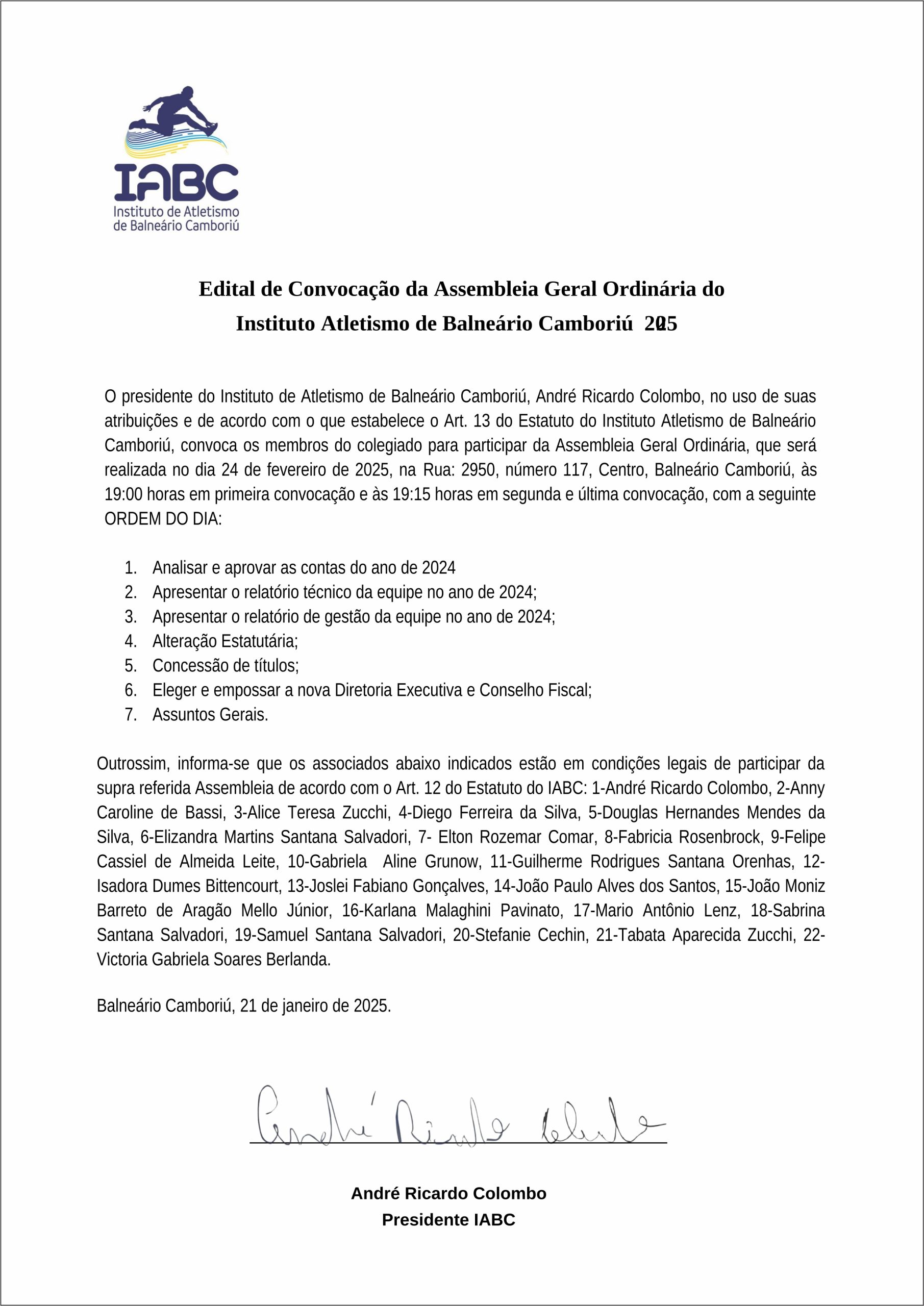 Edital de Convocação da Assembleia Geral Ordinária do Instituto Atletismo de Balneário Camboriú 2025